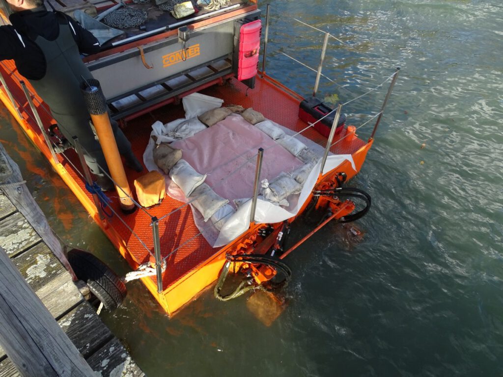 Die Feuerwehr setzte zwei Tauchpumpen (Abwassertauchpumpe Mini-Chiemsee und eine Feuerwehr-Tauchpumpe TP 8) ein, um das Schiff auszupumpen. Da keinerlei Betriebsstoffe im Wasser festzustellen waren, wurde es über B- und C-Schläuche direkt in den Kanal an Land gepumpt. Nachdem der Motorraum ausgepumpt war, wurde die Wartungsluke am Heck wieder verschlossen und zusätzlich mit einer Plane und Sandsäcken gegen Spritzwasser abgedichtet.
